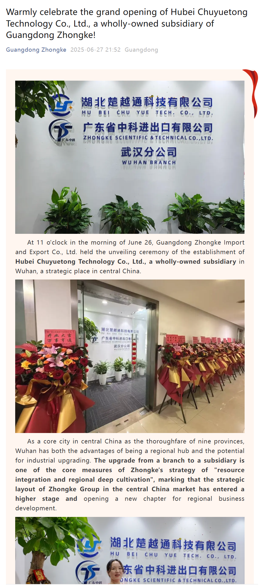 Warmly celebrate the grand opening of Hubei Chuyuetong Technology Co., Ltd., a wholly-owned subsidiary of Guangdong Zhongke!