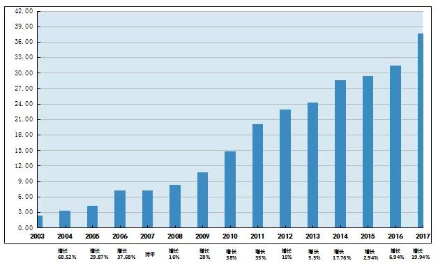 数据分析图一:《爱游戏手机登录入口-爱游戏(中国) 公司2003-2017年营业额数据图》(单位:亿元)